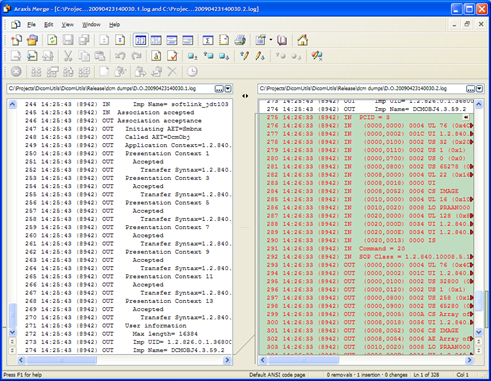 Just before you start, save a copy of the current log. Perform the desired transaction using JDicom (i.e., the tool that works). Update the log page and save a 2nd copy. Now, diff the two logs (image below is illustrating Araxis usage). The difference you are seeing is nothing less than a complete trace of a correct form of the transaction you’re trying to perform.