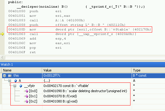 (3) B::B() continues, and modifies the object vfptr to point to the common B vtable: