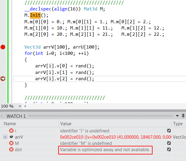 The vast majority of local variables (probably all those which are stored only in registers) are still un-watchable. The ‘Variable is optimized away’ message is a nice direction, but still appears very sporadically. It doesn’t show in the screenshot, but I had no luck stepping into inlined functions too.